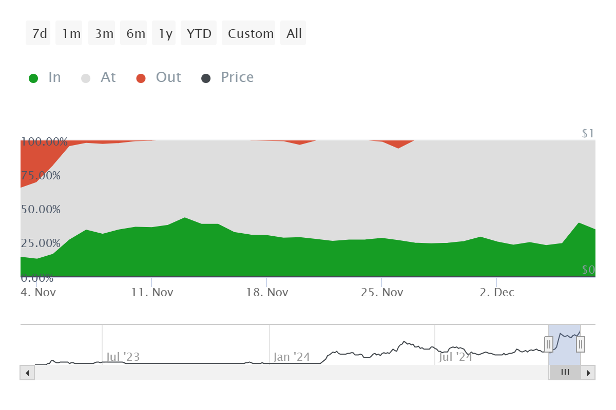 投資家の感情はペペコインに対して利益確定に傾いており、現在約38%のアクティブアドレスが利益を上げている。この傾向は、投資家が利益を確保しようとする中で売り圧力の可能性を示すことが多い。ペペコインが新たなATHに達したことで、この感情はさらに顕著になり、保有者が利益を確定しようとしている。
