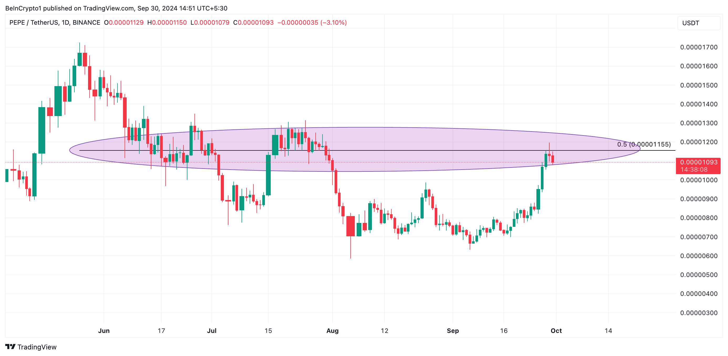 6月以降、0.000011ドルの価格水準はPEPEの重要なレジスタンスポイントとして機能しています。このラインを突破する試みが何度か行われましたが、すべての再テストは失敗しています。
