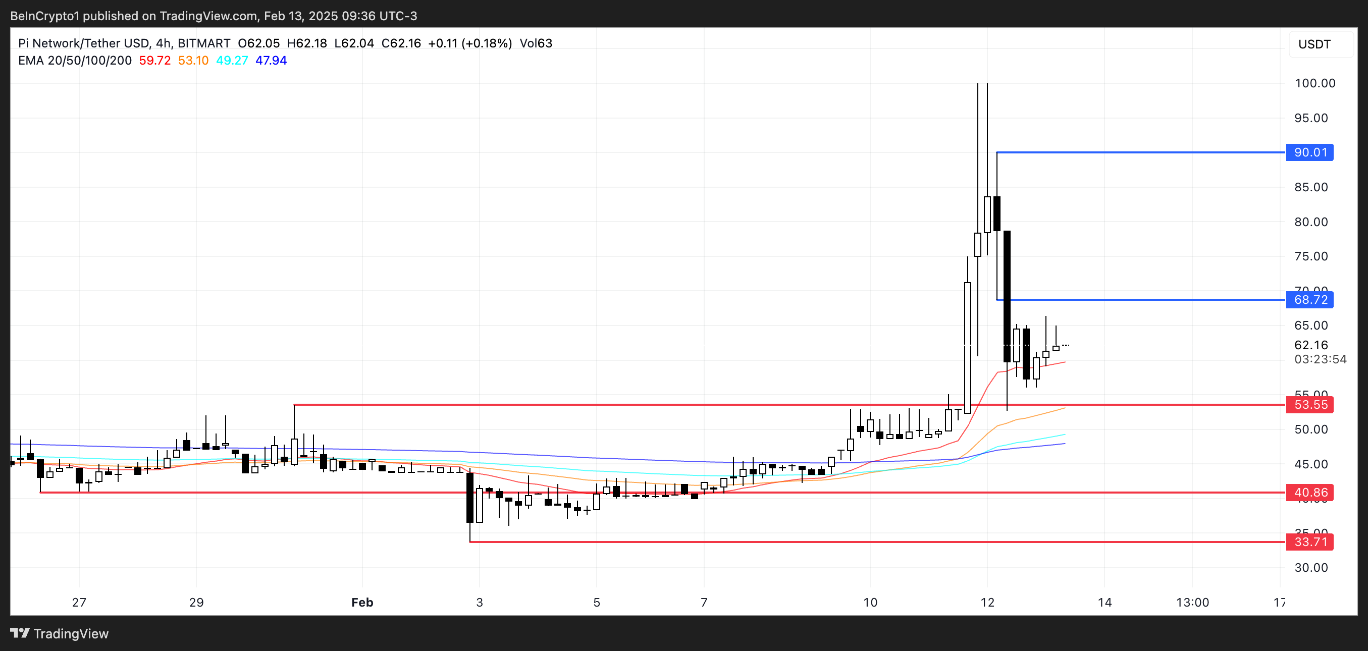この配置は、買い手が引き続き支配しており、トレンドが上向きであることを示唆している。このポジティブなモメンタムが続く場合、PIは68.7ドルの重要な抵抗レベルに向かって押し上げる可能性がある。