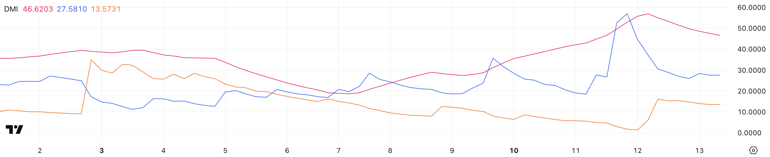 Piネットワークの方向性移動指数(DMI)は、勢いの顕著な変化を示している。平均方向性指数(ADX)は現在46.6で、昨日の56.9から低下している。