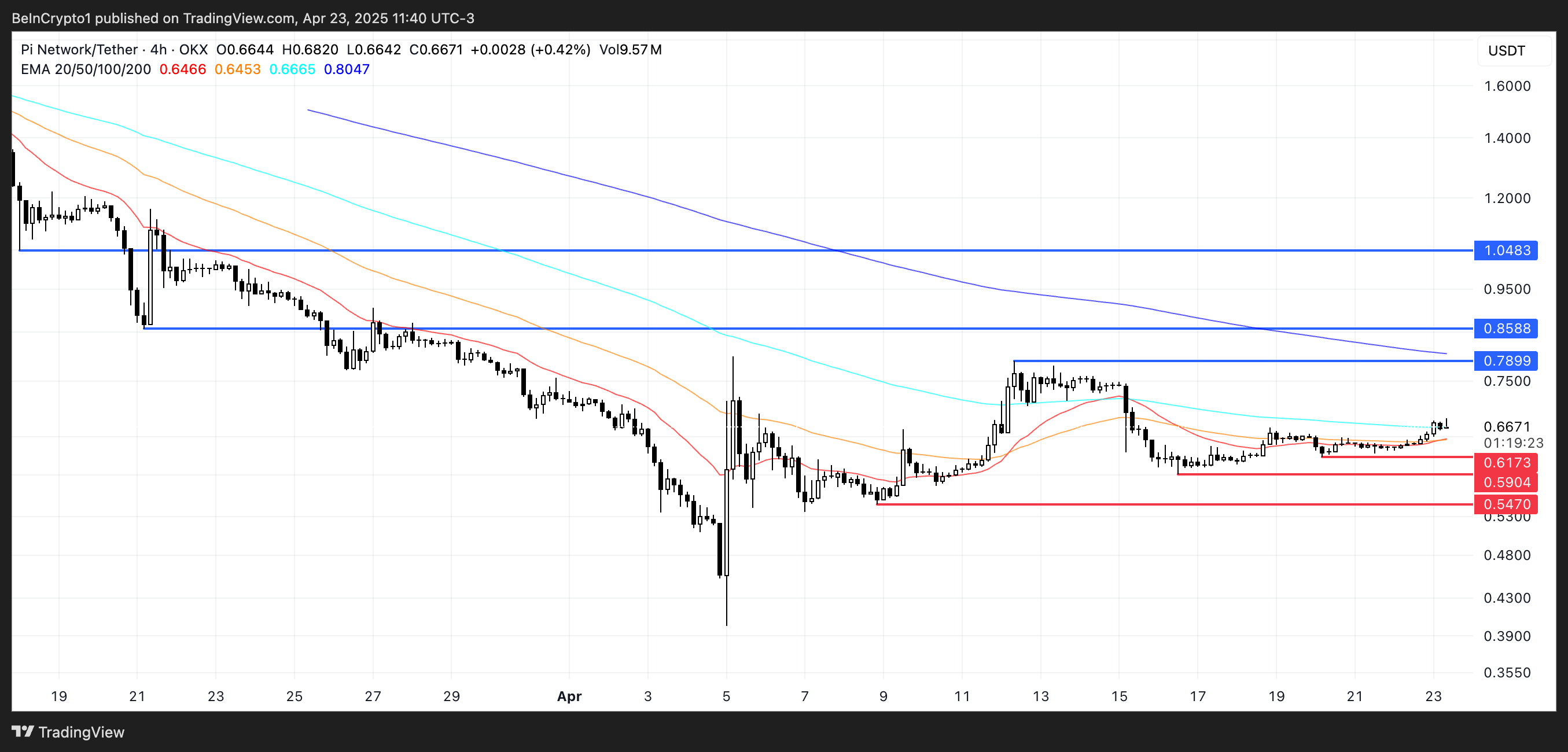 この設定は通常、継続的な下方圧力と強い強気の勢いの欠如を反映している。0.617ドルのサポートが試されて保持できない場合、PIの価格は0.59ドルに下落する可能性がある。
