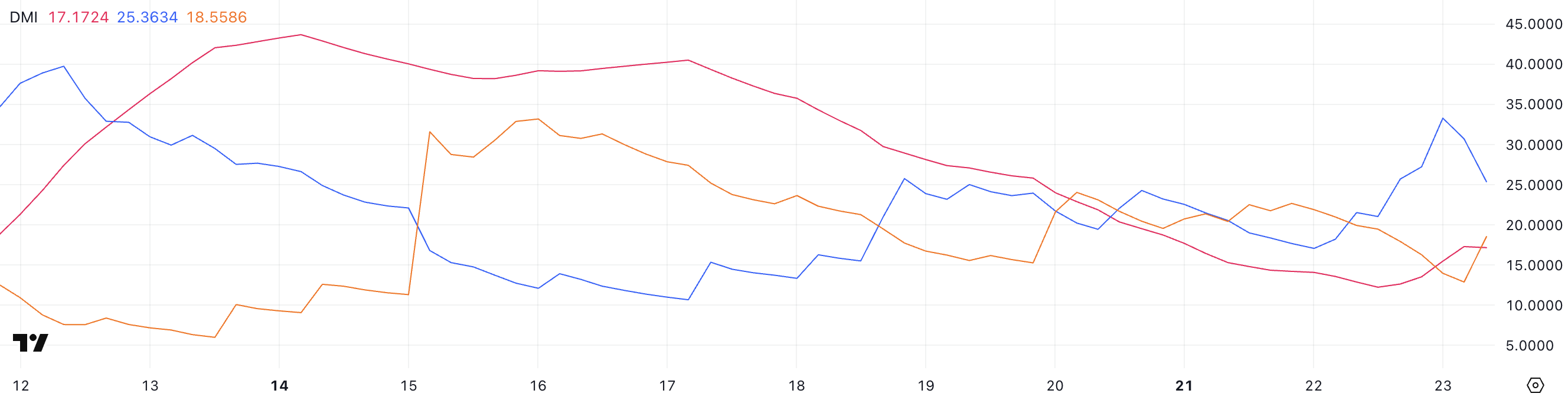 PIの方向性指数(DMI)は、平均方向性指数(ADX)が昨日の12.24から17.17に上昇したことを示している。