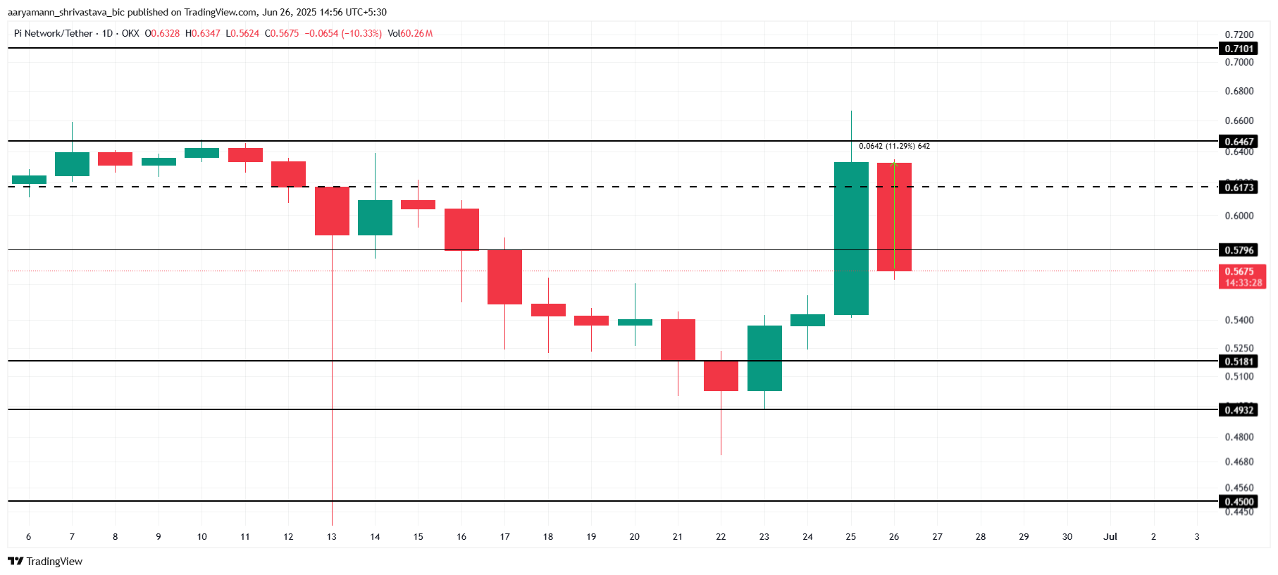パイネットワークの価格は現在11%下落し、0.56ドルで取引されている。この下落は水曜日の15%の上昇後に続くもので、持続しなかった。この下落は、最近の上昇シグナルにもかかわらず、パイネットワークが最近経験しているボラティリティを浮き彫りにしている。