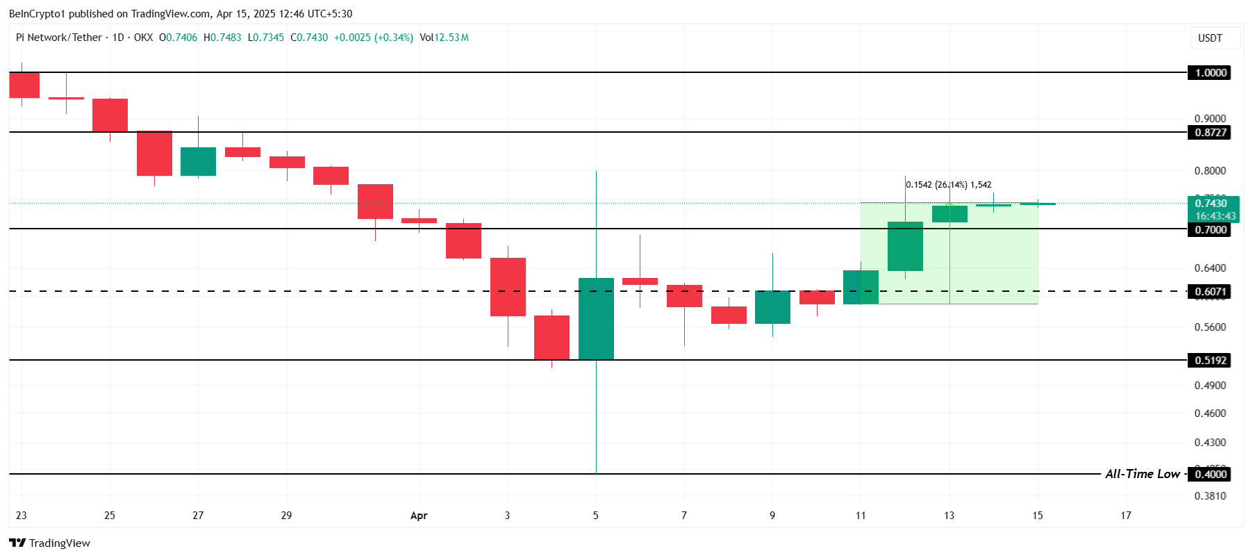 パイネットワークは現在0.74ドルで取引されており、過去5日間で26%上昇している。このポジティブな勢いを維持するためには、パイは0.70ドルのサポートレベルを上回る必要がある。このレベルからの反発は、アルトコインが上昇を続け、次のレジスタンスレベルである0.87ドルを試す可能性を与える。