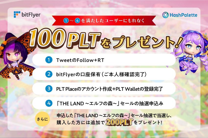 また今回の上場を記念して、兼ねてより両社共同でのゲームトークンのIEOに向けた取り組みを進めている、HashPaletteのブロックチェーンゲーム、「THE LAND 〜 エルフの森〜」と「bitFlyer」のコラボキャンペーンを開催することが明らかになっている。