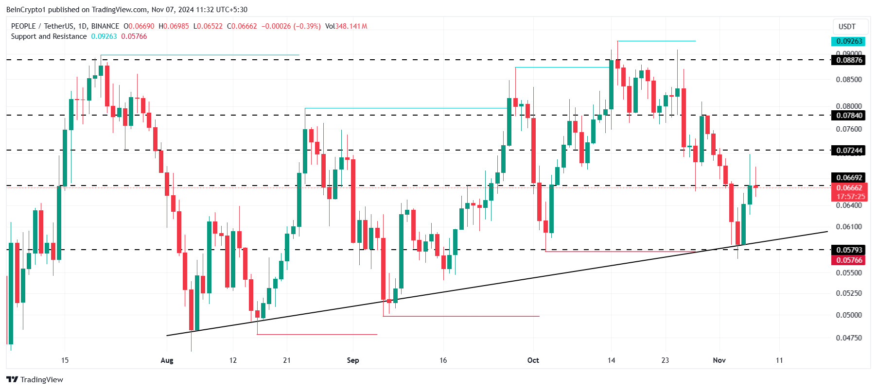 PolitiFi市場の崩壊の中で、ConstitutionDAO(PEOPLE)は唯一の生き残りである。他のトークンとは異なり、PEOPLEはトランプやハリスに直接関連していないため、その強靭さが説明されるかもしれない。数日の上昇後にわずか5.3%の下落を経験した後、PEOPLEは現在0.0666ドルで取引され、0.0669ドルに近づいている。