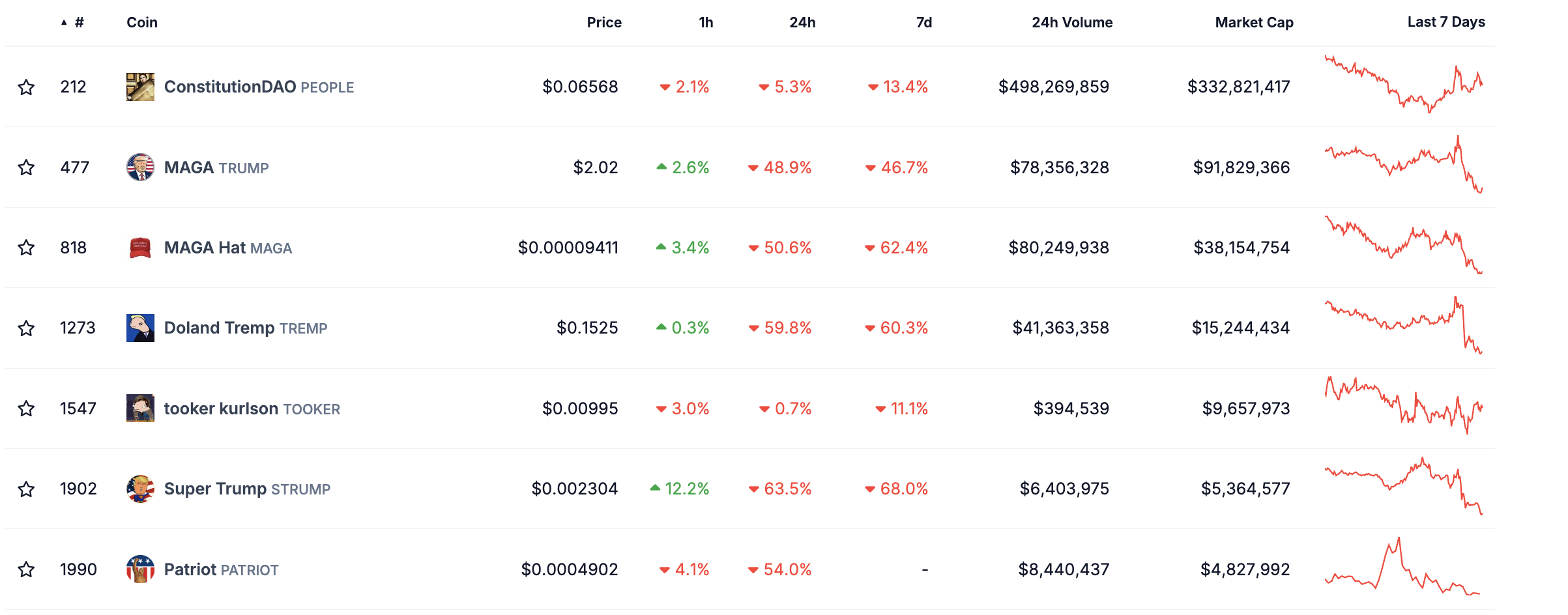 Sponsored興味深いことに、選挙後にトランプテーマのトークンも急落した。TRUMP、MAGA、TREMPコインはそれぞれ48.9%、50.6%、59.8%下落し、勝利した候補者のトークンでさえ苦戦していることを示している。この市場の反応は、選挙に駆り立てられた資産からトレーダーが素早く離れていることを示している。