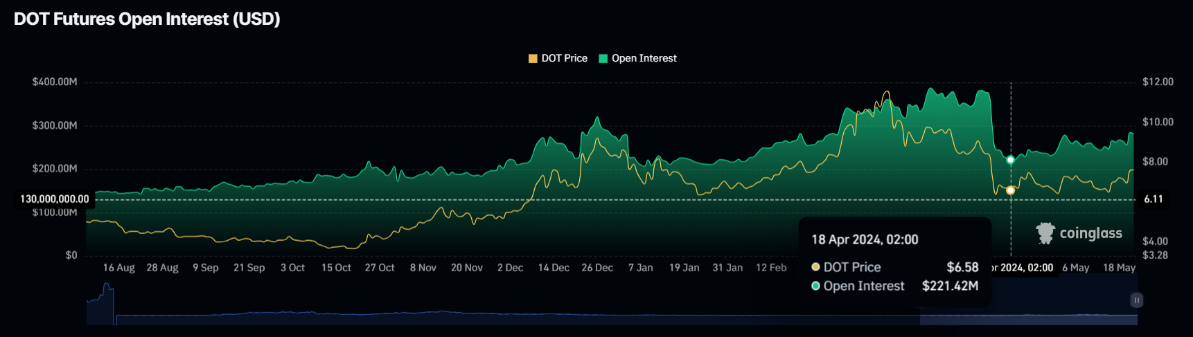 Sponsored建玉(OI)とは、先物やオプションなど、まだ決済されていないアクティブなデリバティブ契約の総数を指す。DOTの場合、このOIは6,300万ドル以上増加し、わずか3日間で2億2,100万ドルから2億8,400万ドルになった。