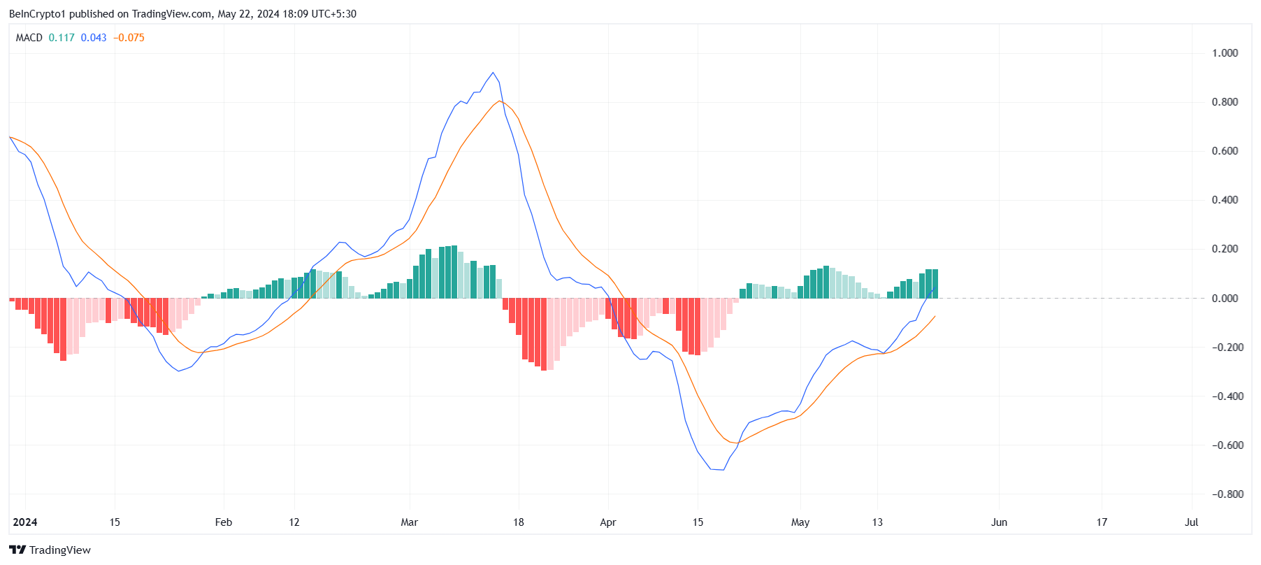 さらに、移動平均収束ダイバージェンス(MACD)も強気の急上昇を観測している。MACDはトレンドに追随するモメンタム指標で、資産価格の2つの移動平均の関係を示し、潜在的な売買シグナルを特定するのに役立つ。