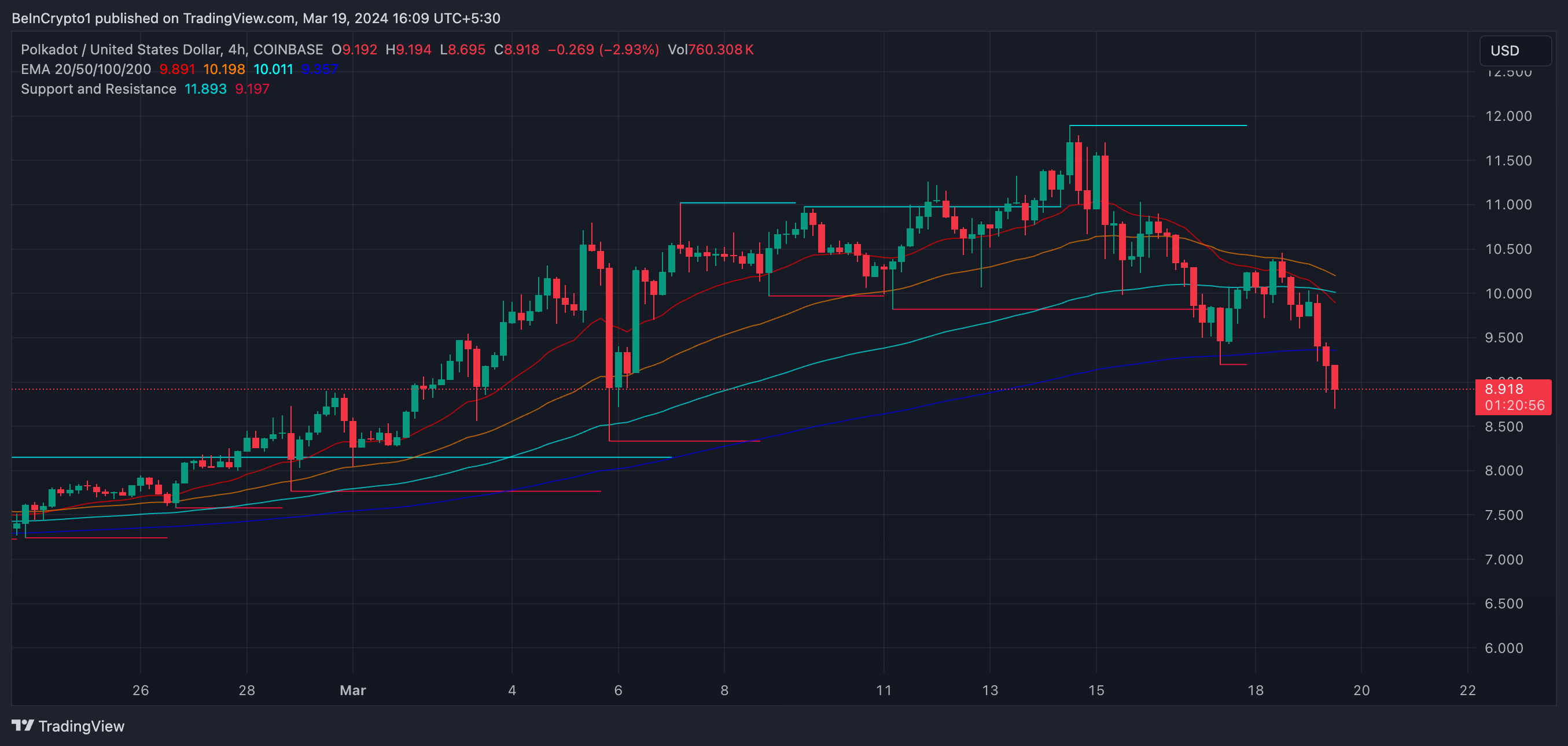 DOTの価格分析について、チャートによると、価格は現在下降トレンドにあり、最近20日EMAを下回った。8.33ドル付近のサポートゾーンは非常に重要であり、価格がこのレベルを下回れば、さらなる下落を示す可能性があり、次のサポートは7.75ドル付近になる可能性がある。これはデスクロスからの弱気シグナルと一致する。これは13.7%の調整となる。