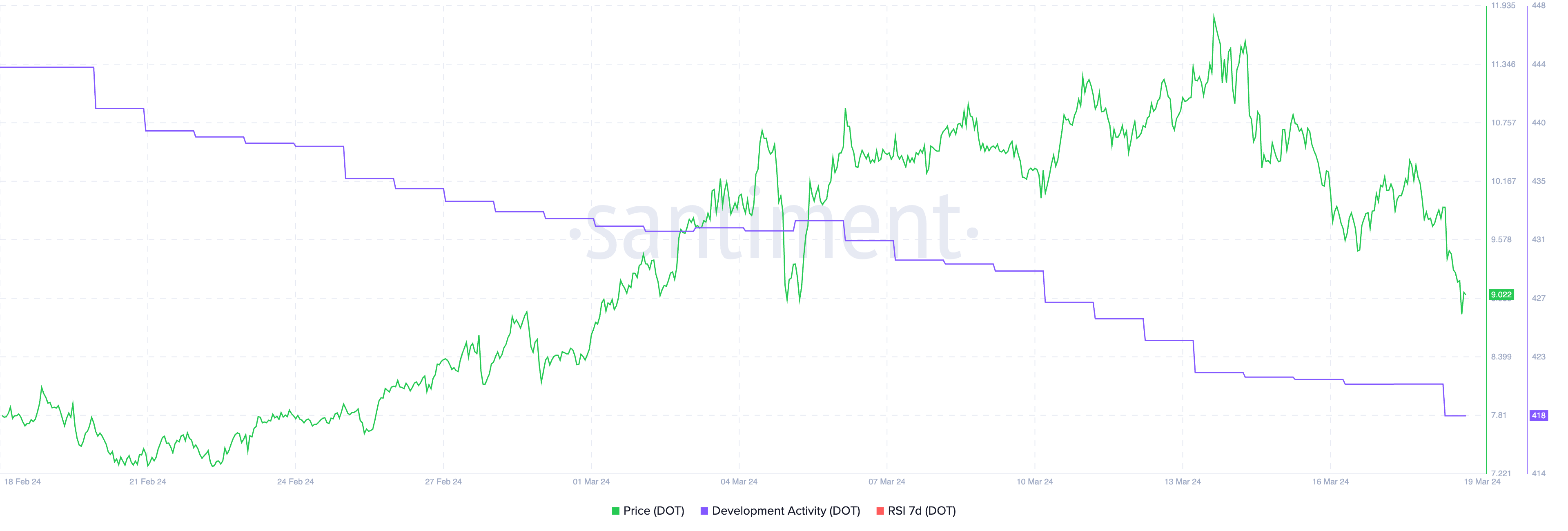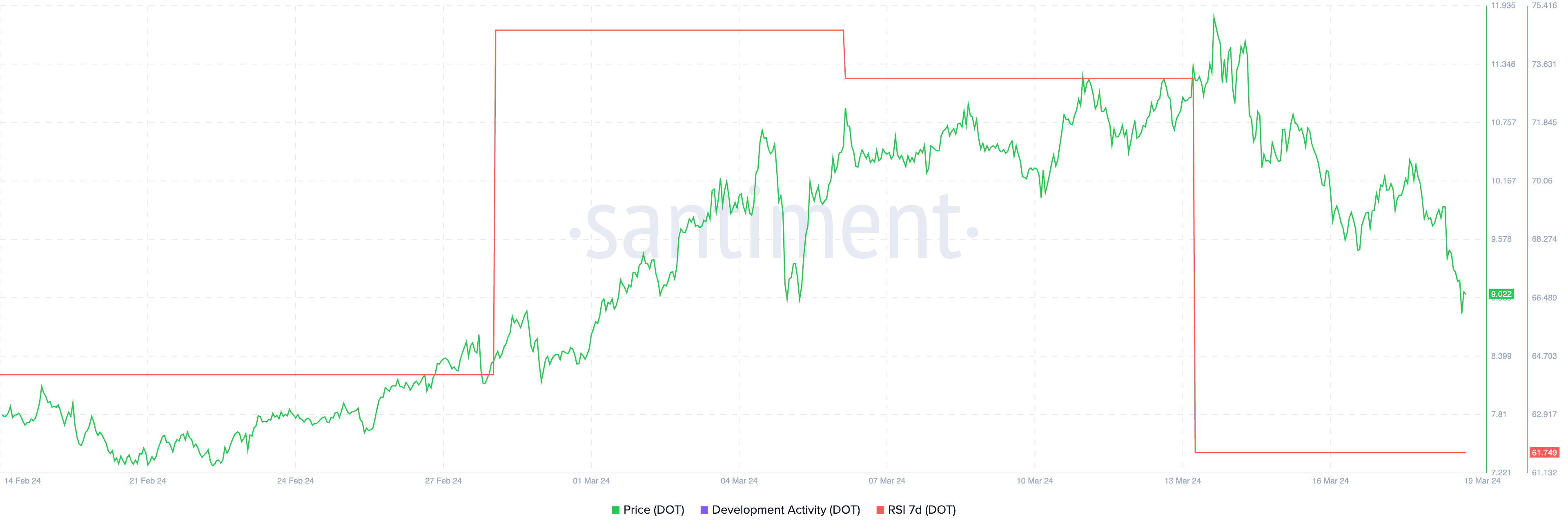 そして2月11日から2月19日にかけて、またもやその現象が起きた。DOT価格は7.01ドルから8.03ドルに上昇した。同時に、開発アクティビティは12%減少した。この2つの指標の乖離は、DOT価格が2024年に1月1日の8.60ドルから3月13日の11.6ドルまで伸びたのはすべて外部要因によるものであることを示している。これらの要因は、暗号資産全体の強気など、ファンダメンタルズとは直接関係ない可能性がある。