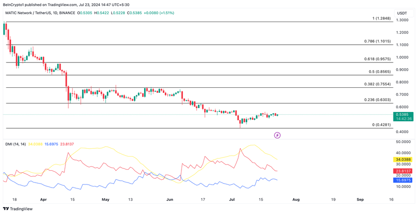 MATICのDirectional Movement Index (DMI)の設定は、アルトコインに対する弱気バイアスを確認し、現在のトレンドが続く場合、さらなる下落を示唆しています。プレスリリース時点では、トークンの負の方向性指標(-DI)は正の方向性指標(+DI)を上回っています。