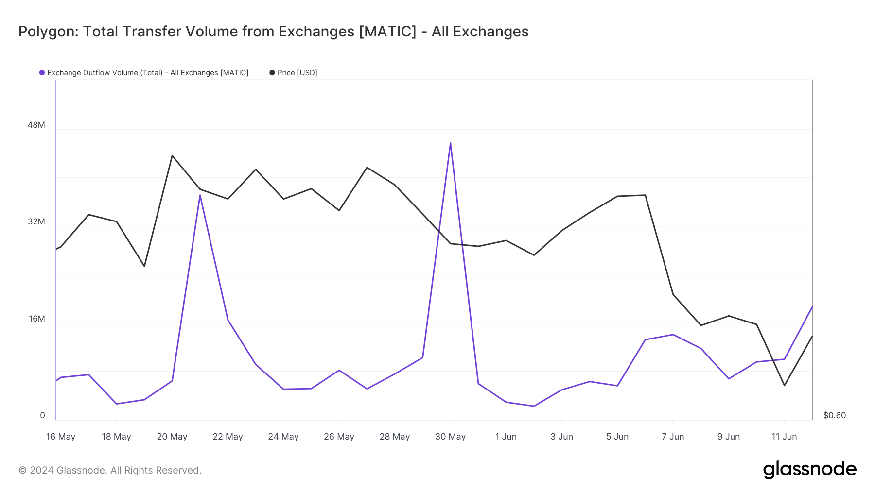 6月4日の取引所への総流入量は約396万MATICだった。6月12日には、この流入量は約1,398万MATICに急増し、1,000万MATICの大幅な増加を反映した。
