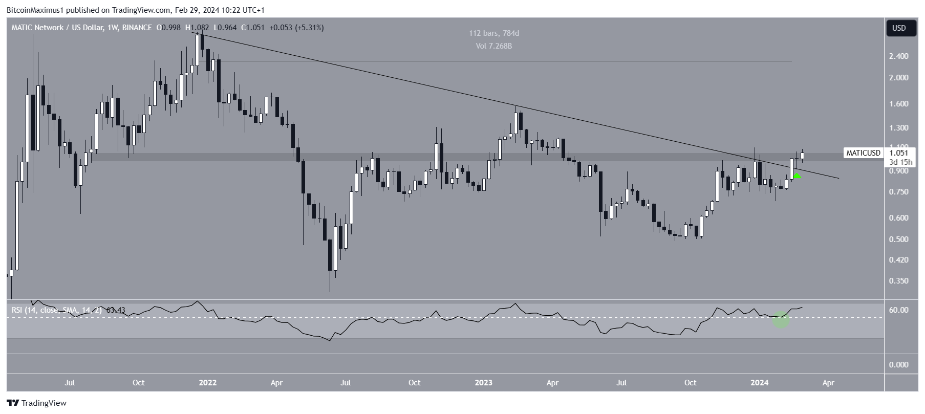 週足で見ると、MATICは2023年10月から上昇している。2週間前、この上昇の動きは、史上最高値以来存在していた長期下降抵抗線からのブレイクアウトを引き起こした。ブレイクアウト時、このトレンドラインは780日間続いていた。