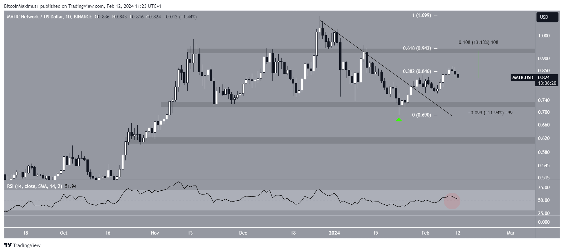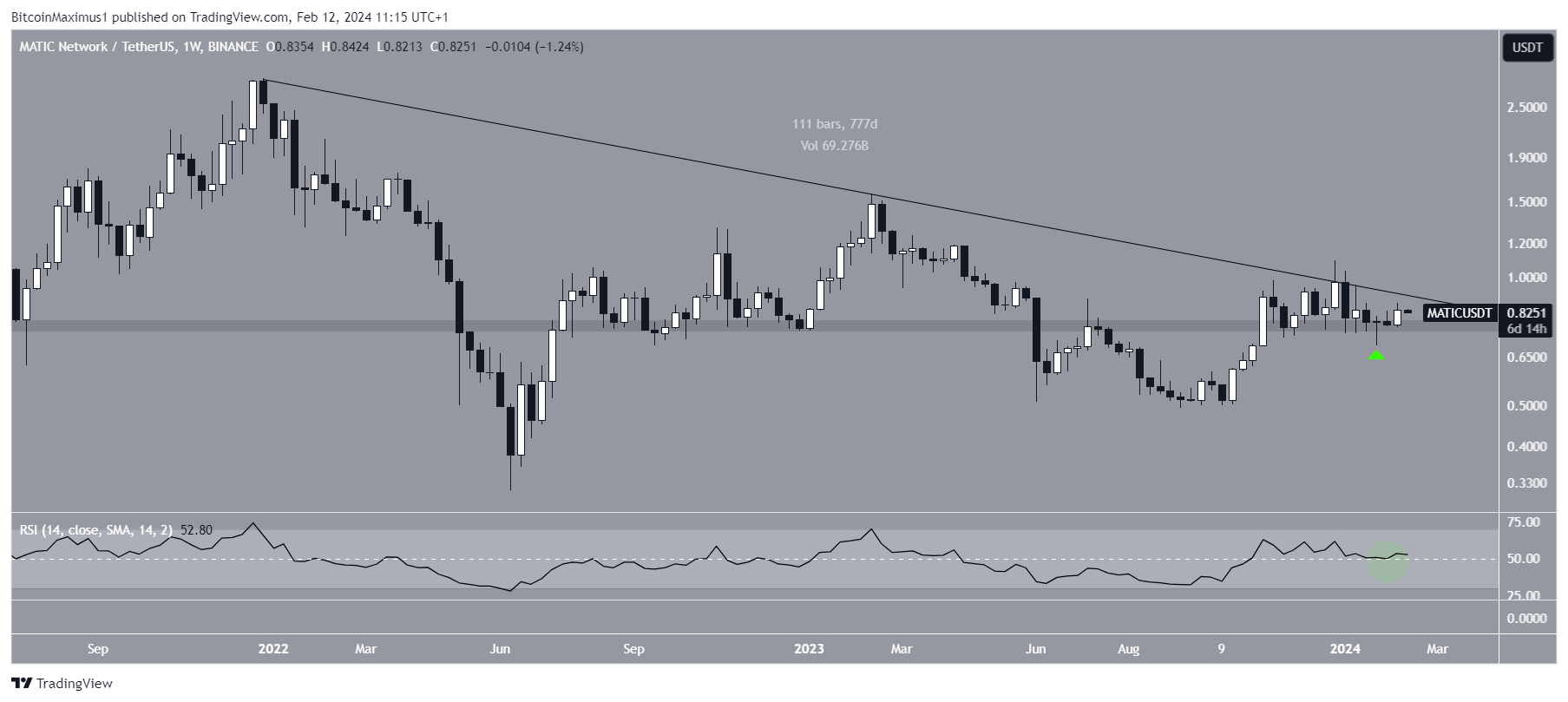 その後MATICは下落したが、現在も水平線エリアの上で取引されており、サポートとして機能している。MATICは2024年1月に反発し、長い下値ウィック(緑色のアイコン)を形成した。バウンスにもかかわらず、価格は780日間存在する長期下降トレンドラインの下で取引されている。