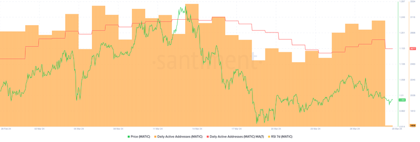ポリゴン(MATIC)は3月14日、1日のアクティブアドレス数が3,301に急増し、価格も1.27ドルに急騰し、2023年2月以来の最高値を記録した。