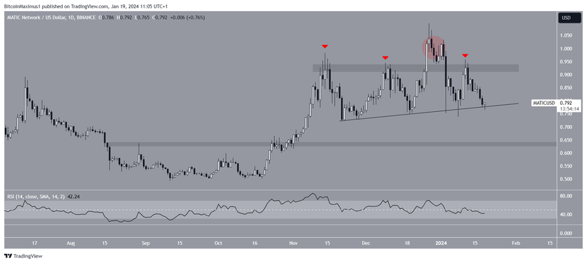 日足時間軸のテクニカル分析によると、MATIC価格は2023年11月以降、0.95ドルの水平レジスタンスエリアの下で取引されている。