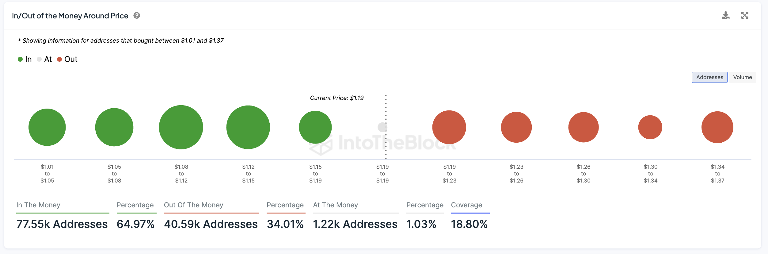 イン/アウト・オブ・ザ・マネー・アラウンド・プライス(IOMAP)チャートは、資産の現在価格に対する投資家のポジションのクラスターを視覚化するために使用される分析ツールです。大量の買い注文や売り注文が集中している価格水準を特定し、実際の投資家の保有ポジションに基づく重要な支持線と抵抗線を効果的にマッピングします。
