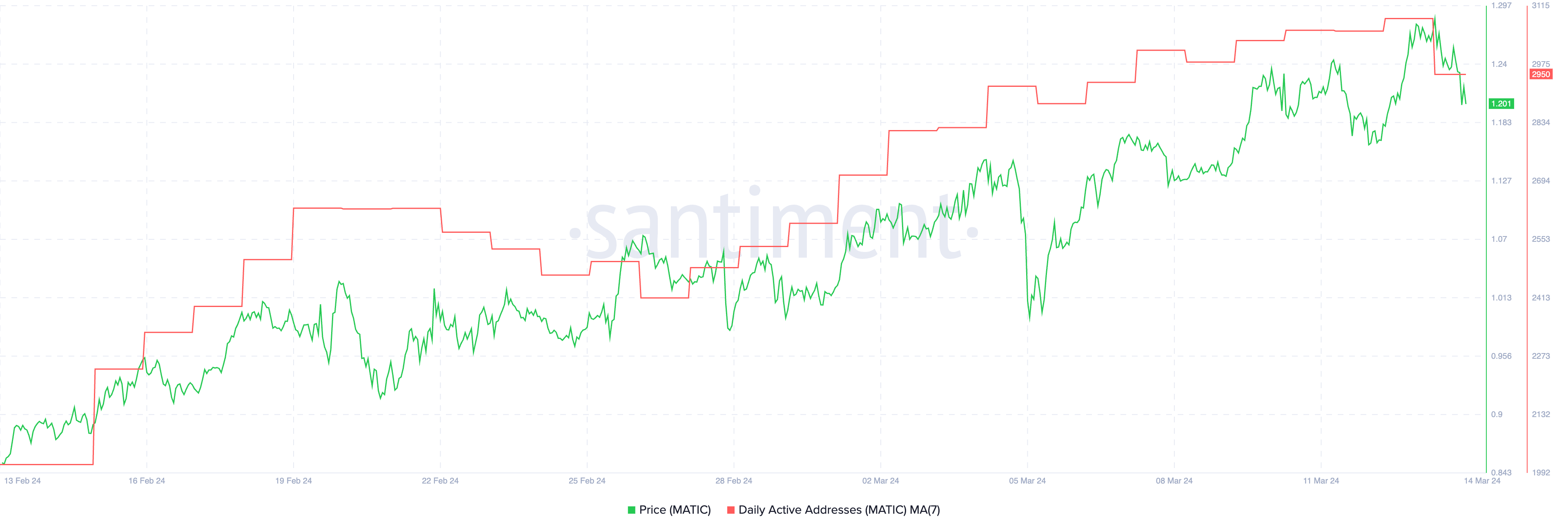 2月13日から3月7日にかけて、MATICのデイリーアクティブアドレス数は2,468から3,275に急増した。これは、わずか3週間で32.70%という顕著な伸び率を示している。