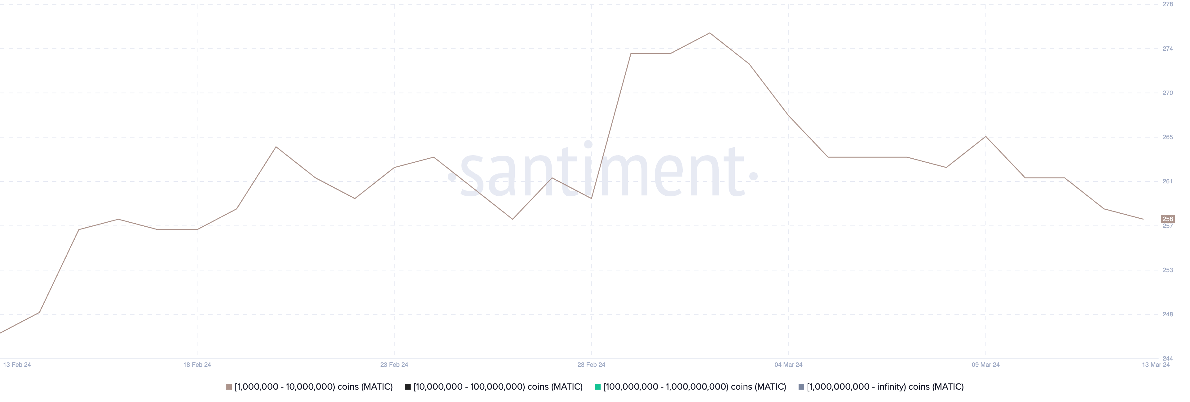 MATICを100万枚以上保有するアドレスの数も減少している。3月2日には276のMATICホエールが存在し、過去最高を記録した。しかしその日以来、クジラの数は減少し、3月14日には258になった。
