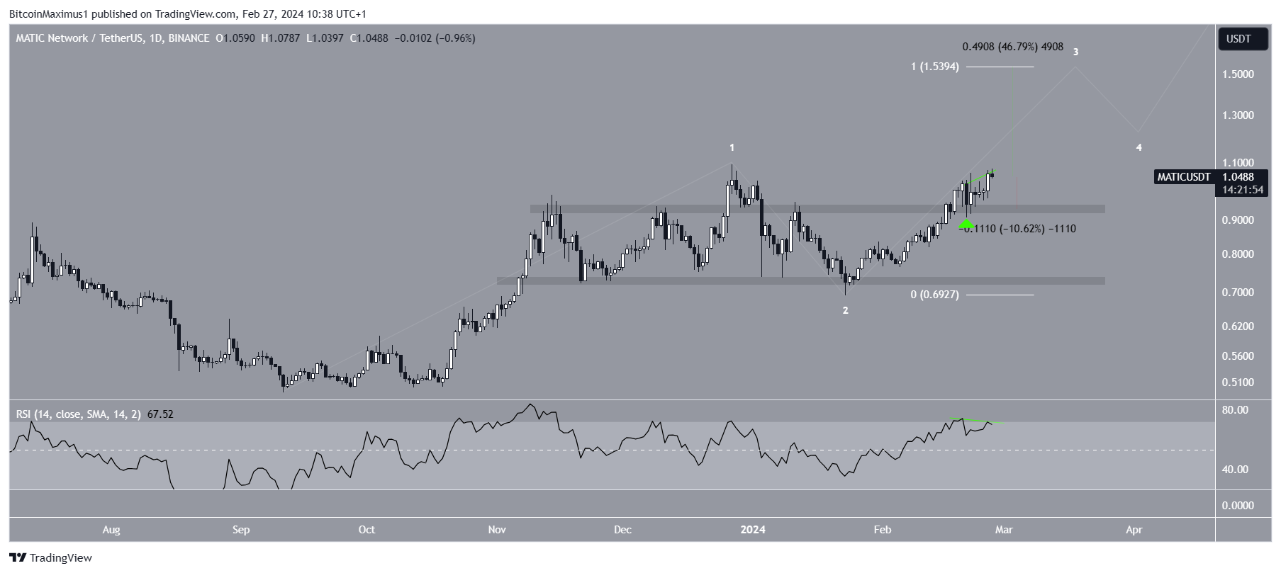 最も可能性の高いカウントは、MATIC価格が5つの上昇波動の第3波動にあることを示唆している。第1波と第3波が同じ長さだとすると、高値は1.54ドルとなり、現在価格の50%近く上となる。しかし、日足RSIは弱気ダイバージェンスの形で弱さを示している。