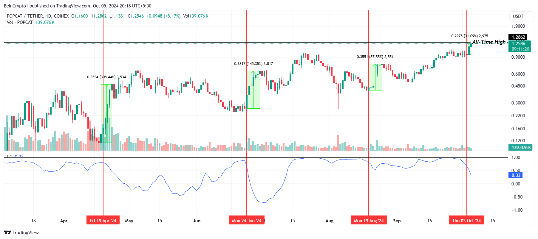 POPCATの最近のラリーの背後にある主要な要因の一つは、ビットコイン(BTC)との相関の欠如です。多くのアルトコインがBTCの価格変動に同調する傾向がある中、POPCATはビットコインとの相関が低下するときにより良いパフォーマンスを示しています。現在、POPCATとBTCの相関は0.33に落ち込み、関係が弱まっています。