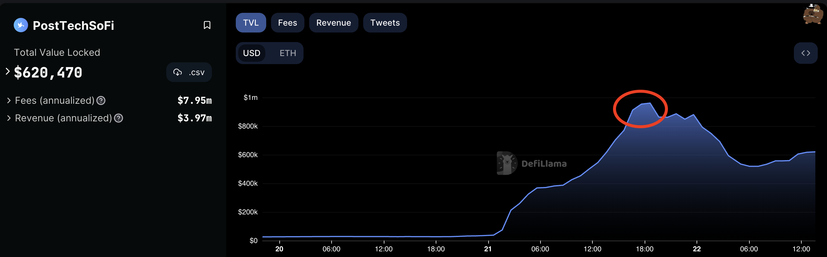 DeFi分析プラットフォームDefiLlamaによると、ポストテックのTVLは21日、3万8180ドルから96万1100ドル(約1億4200万円)に急増。 同日の間に25.2倍の上昇率を記録した。同日夜をピークに減少し、本稿執筆時点のTVLは、およそ62万ドル(約9200万円)。