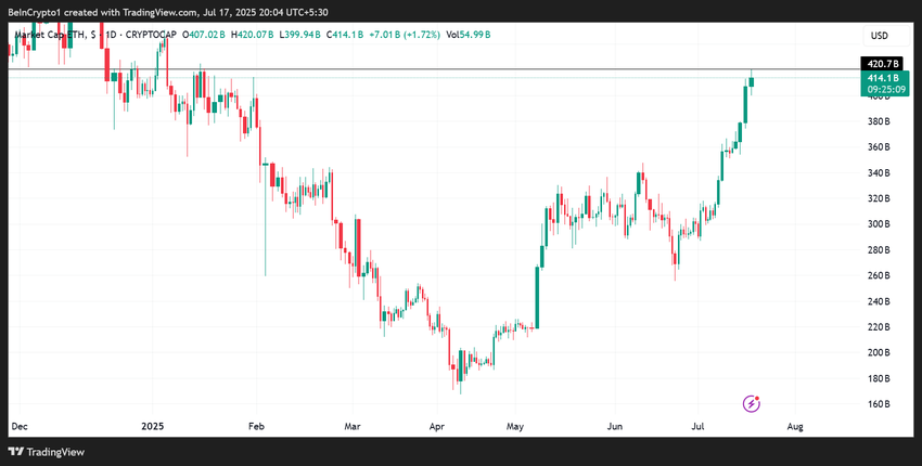 TradingViewのデータによれば、イーサリアムの総時価総額は7月17日木曜日に4200億ドルを超え、その後調整が入った。