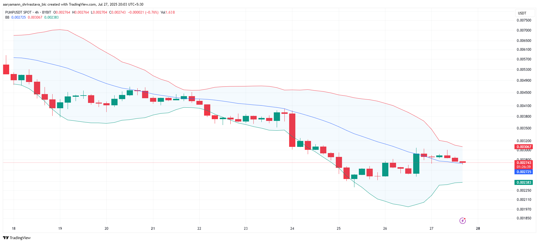 PUMPは現在0.0027ドルで取引されており、0.0029ドルの抵抗レベルをわずかに下回り、0.0024ドルのサポートレベルを上回っている。この統合フェーズは一時的な安定を提供するかもしれないが、アルトコインは依然としてさらなる下落に対して脆弱である。