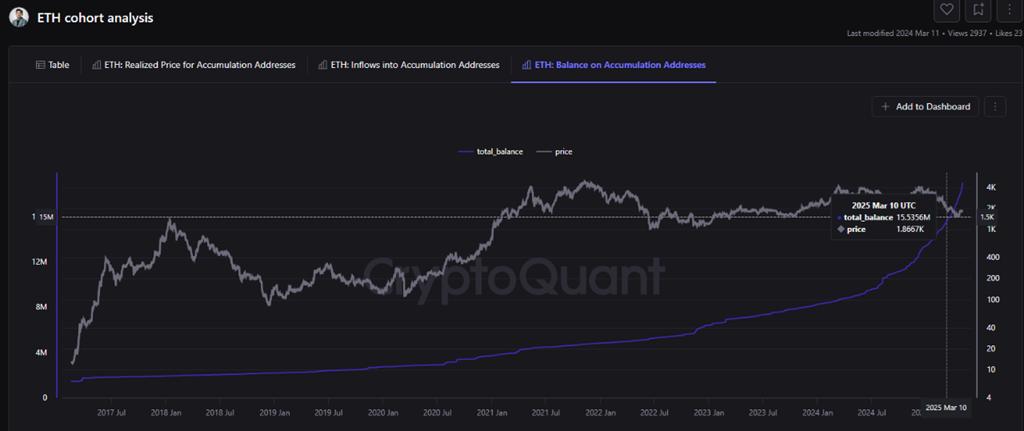 3月10日には、蓄積アドレスは1,553万5600ETHを保有していた。5月3日までに、この数は1,903万7800ETHに増加し、22.54%の増加となった。