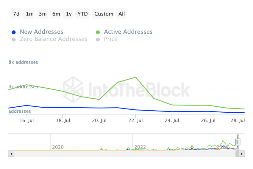 しかし、RENDERは、売り圧力が蓄積を上回り始めると、サポートレベルまで下落し、それを下回る可能性もある。IntoTheBlockのオンチェーンデータによると、トークンの毎日のアクティブアドレス数と新規アドレス数はこの1週間で大幅に減少している。