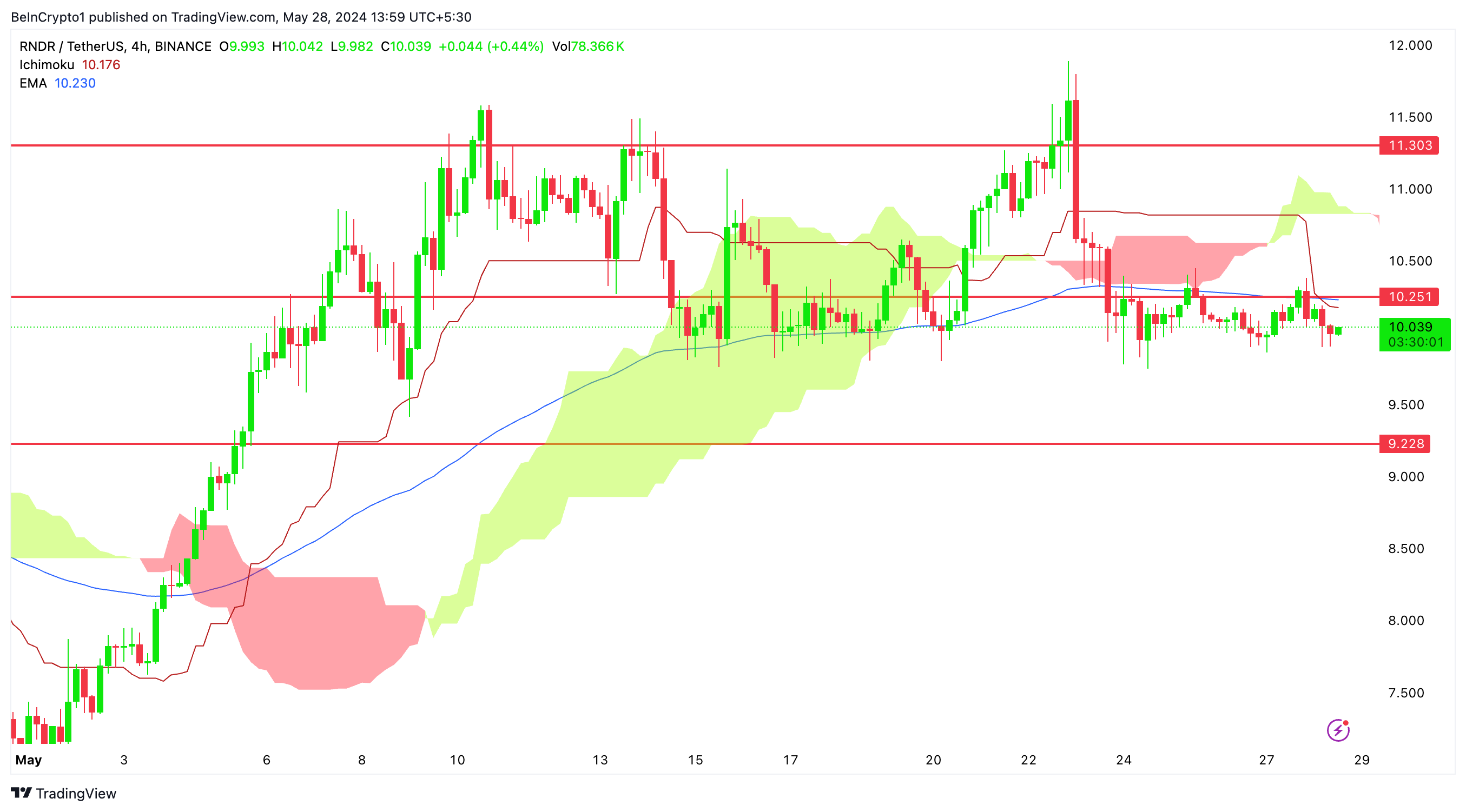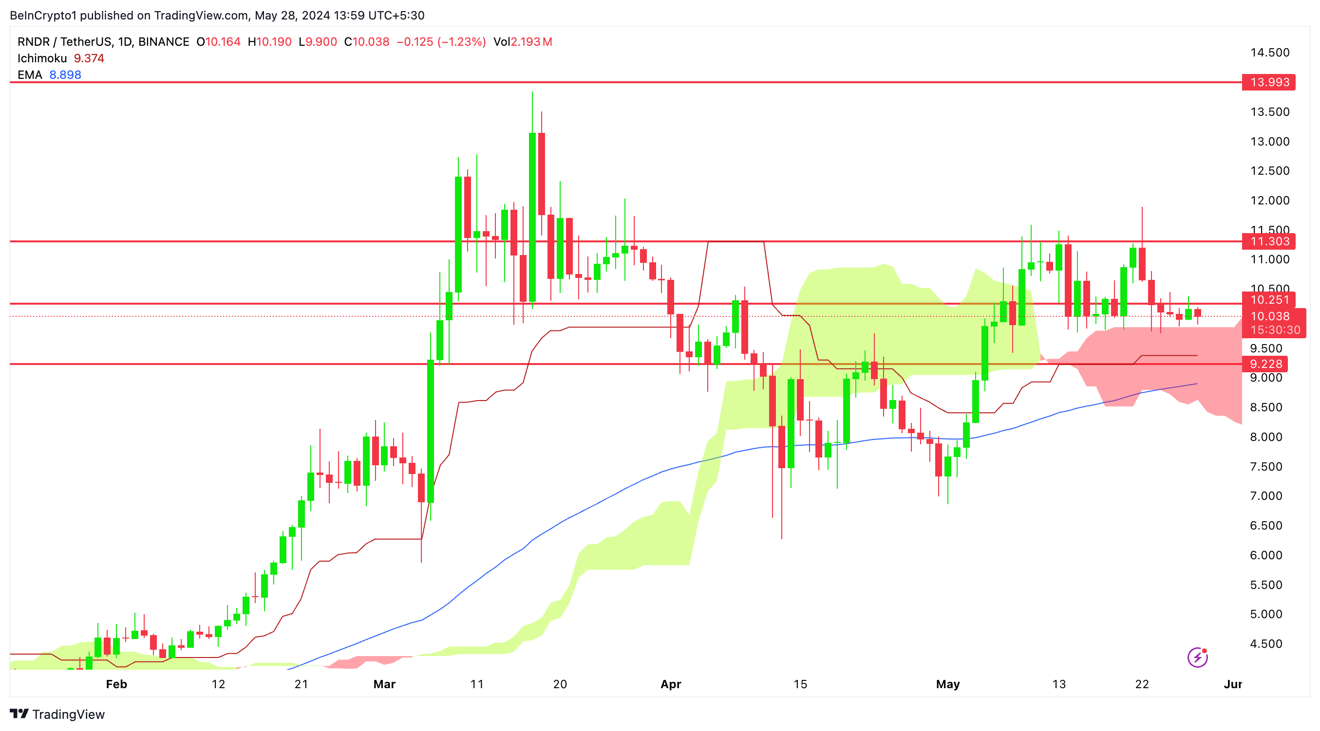 この分析では、一目均衡表と重要なサポート/レジスタンスレベルを活用し、日足と4時間足の両タイムフレームでRNDRのプライスアクションに関する洞察を提供し、トレーダーに戦略的な推奨を行います。