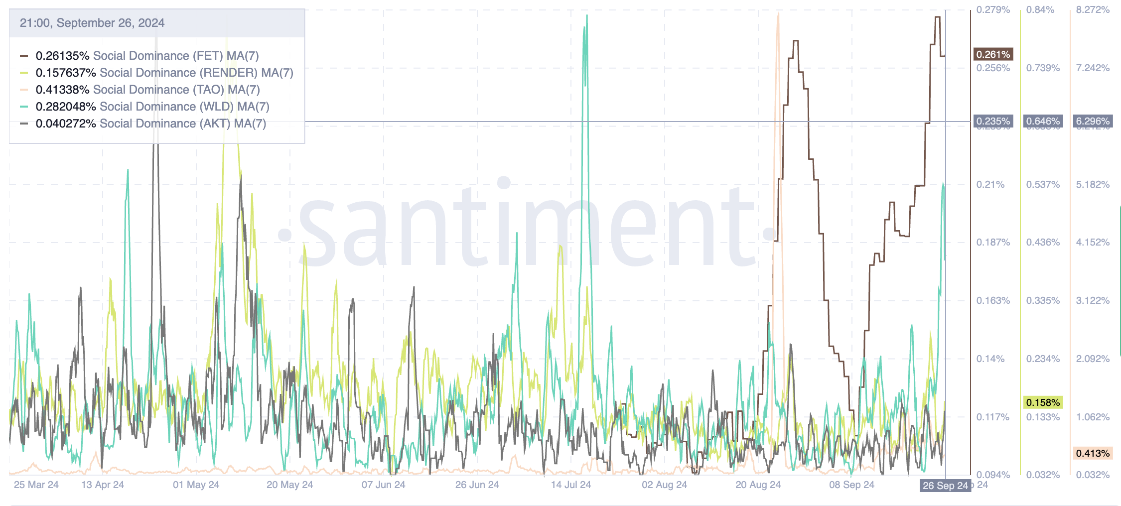 時価総額で3番目に大きいAIトークンとしてランク付けされているにもかかわらず、RNDRは社会的優位性の点で4位にしかランクされていません。これは、一部の競合他社と同じレベルの注目や誇大宣伝を集めていないことを示唆しています。 FET、 TAO、 WLD などのプレーヤーは、一般の人々の注目を集め、RNDR は知名度を競うようになり、注目度では AKT を上回っています。
