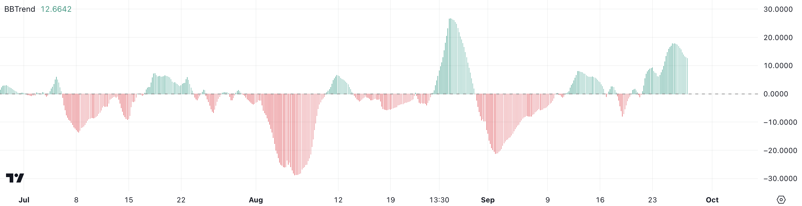 BBTrendは、バンドがどのように拡大または縮小しているかを具体的に調べて、ボラティリティが増加しているか減少しているかを示し、これはしばしば潜在的な価格変動を示唆しています。