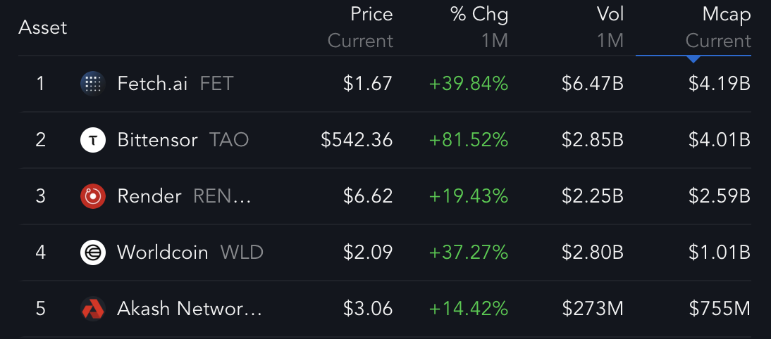 この社会的支配の低パフォーマンスは、その相対的な価格の伸びと一致しています。過去1ヶ月間で、RNDRは19%上昇し、かなりの伸びを示しましたが、それでもFET(39.84%増)、TAO(81.52%増)、WLD(37.27%増)には大きく遅れをとっています。