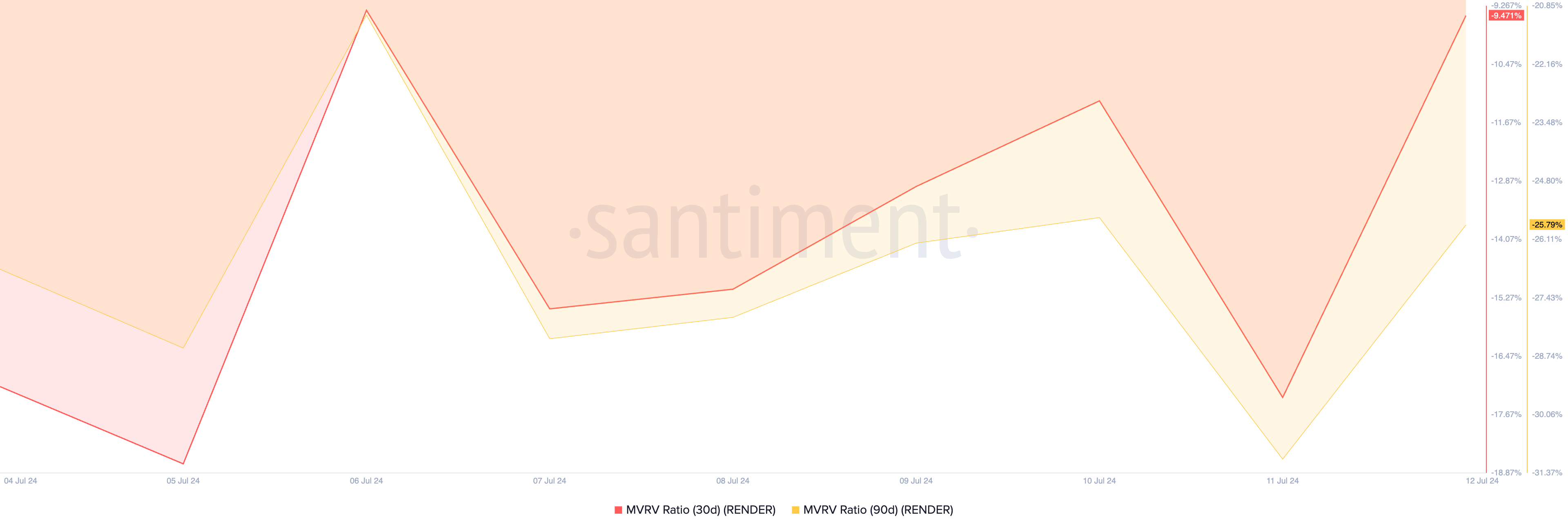 RENDERの実現価値に対する市場価値(MVRV)比率によると、現在、アルトコインは過小評価されているため、今が買い時かもしれない。異なる移動平均線上で評価した場合、この比率のマイナス値がこれを裏付けている。Santimentによると、RENDERの30日MVRレシオは-9.47、90日MVRレシオは-25.79である。