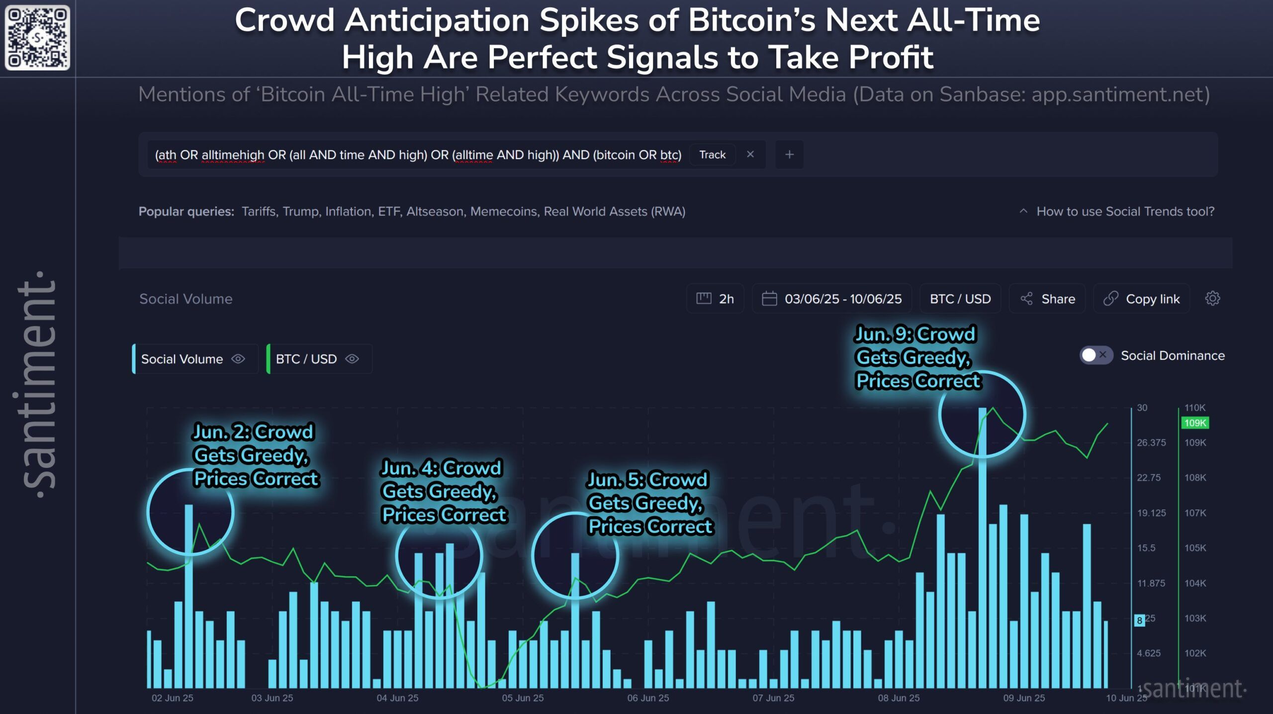 「市場は小口投資家の期待とは逆の方向に動くため、BTCのATHに関連する議論の急増は、貪欲を示す確固たるトップシグナルである」とSantimentは付け加えた。