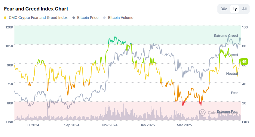 この傾向は、暗号資産市場のセンチメントを広く測る指標であるCoinMarketCapの恐怖と貪欲指数と一致している。2025年6月時点で、この指数は「貪欲」ゾーンに入り、60を超える数値を示している。