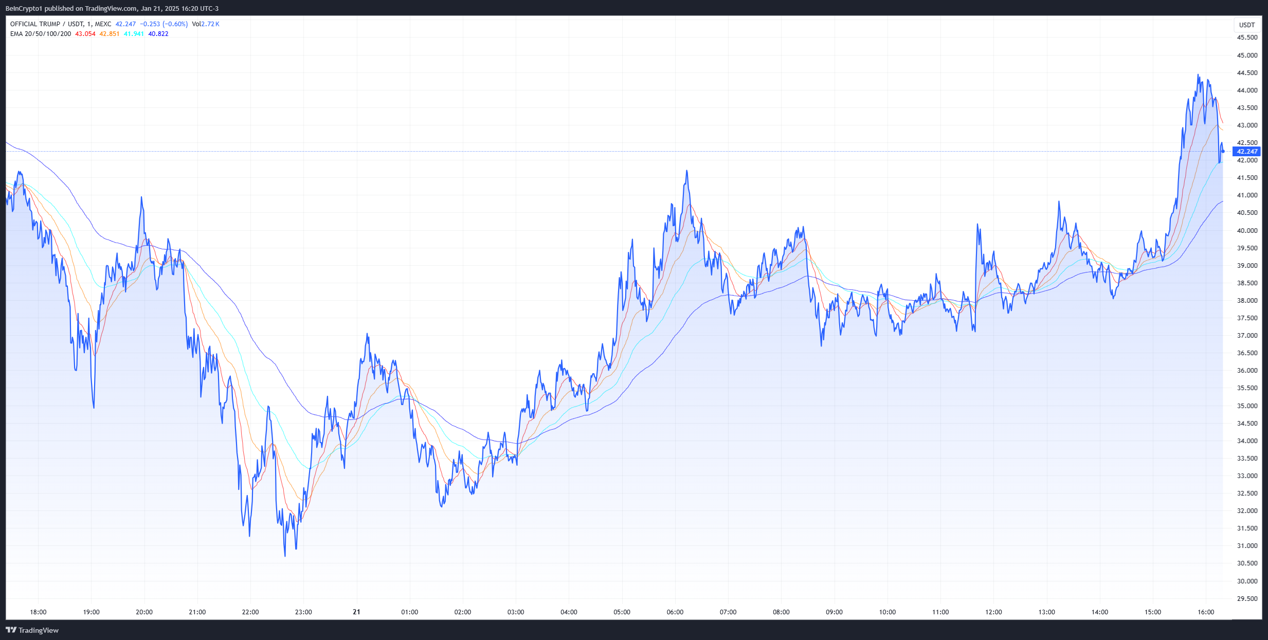 それにもかかわらず、TRUMPミームコインはこのニュースに反応しました。トークンは、日中の下落後、過去1時間で約8%急騰しました。