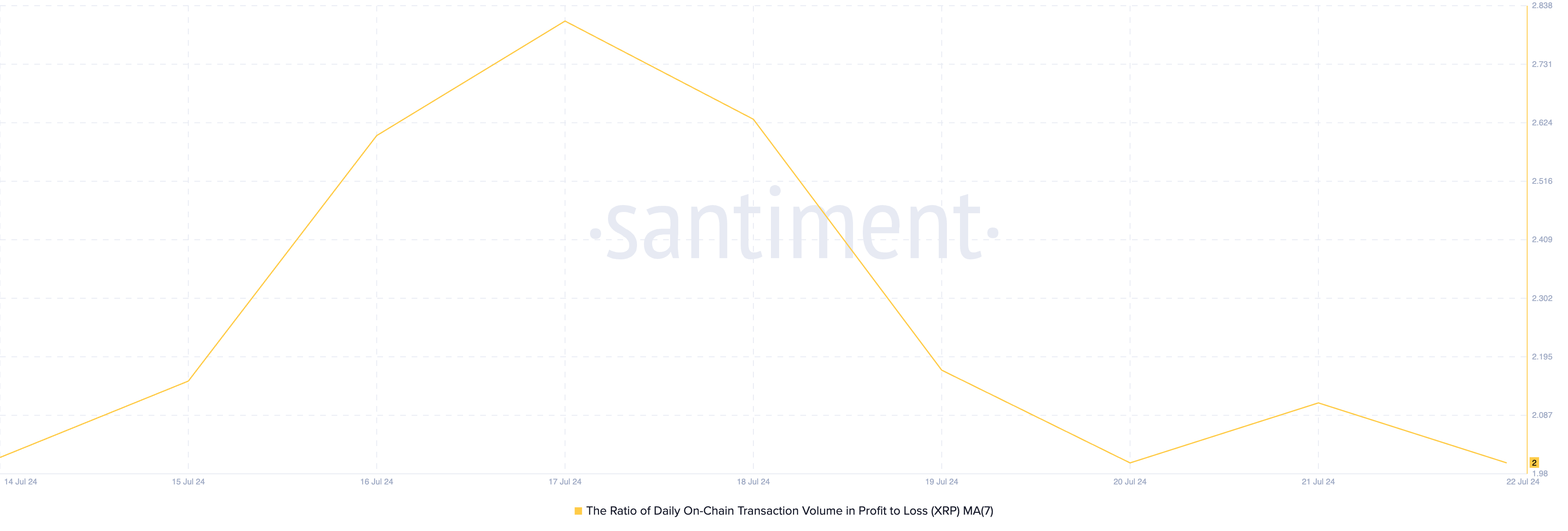 XRPの1日の取引量の利益と損失の比率は2で、XRPの保有者が過去1週間の価格上昇により損失よりも利益を多く記録していることを示している。