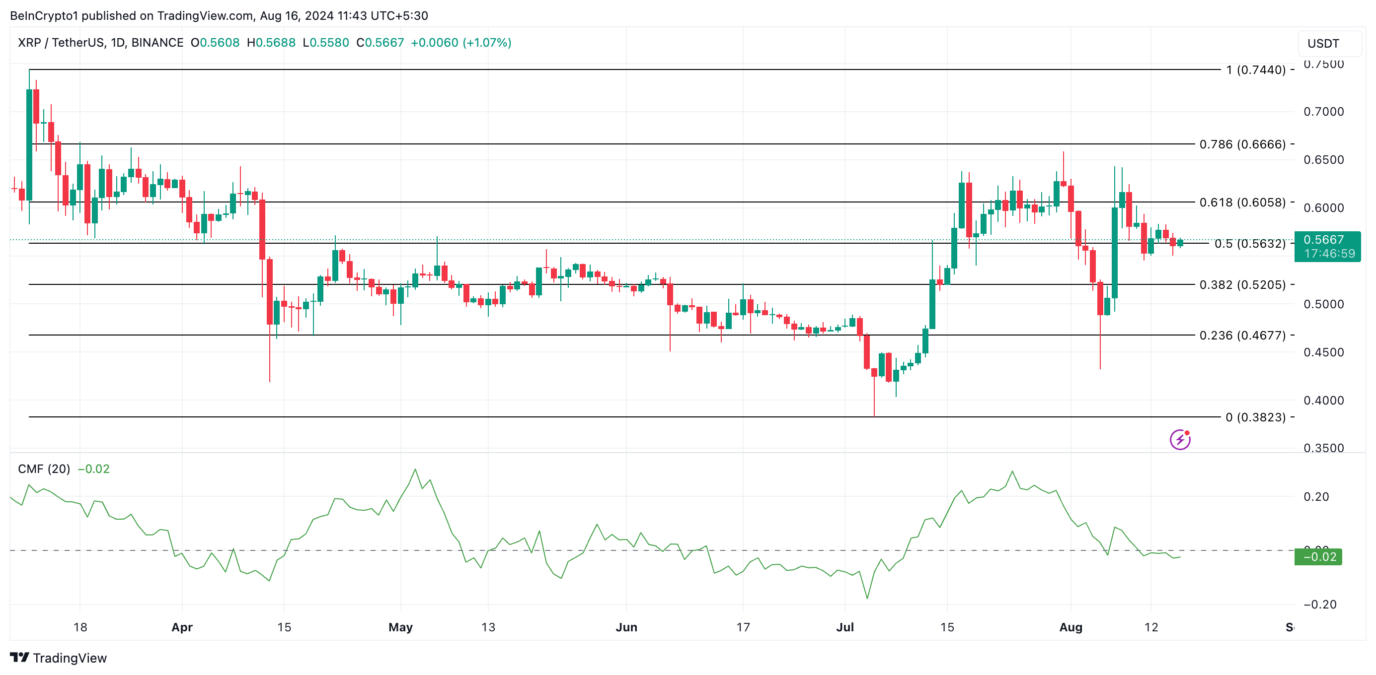 XRP市場からの流動性の流出は、マイナスのチャイキン・マネー・フロー(CMF)に反映されています。この記事を書いている時点で、この指標はゼロラインを下回っており、8月11日以来そのような位置にあります。
