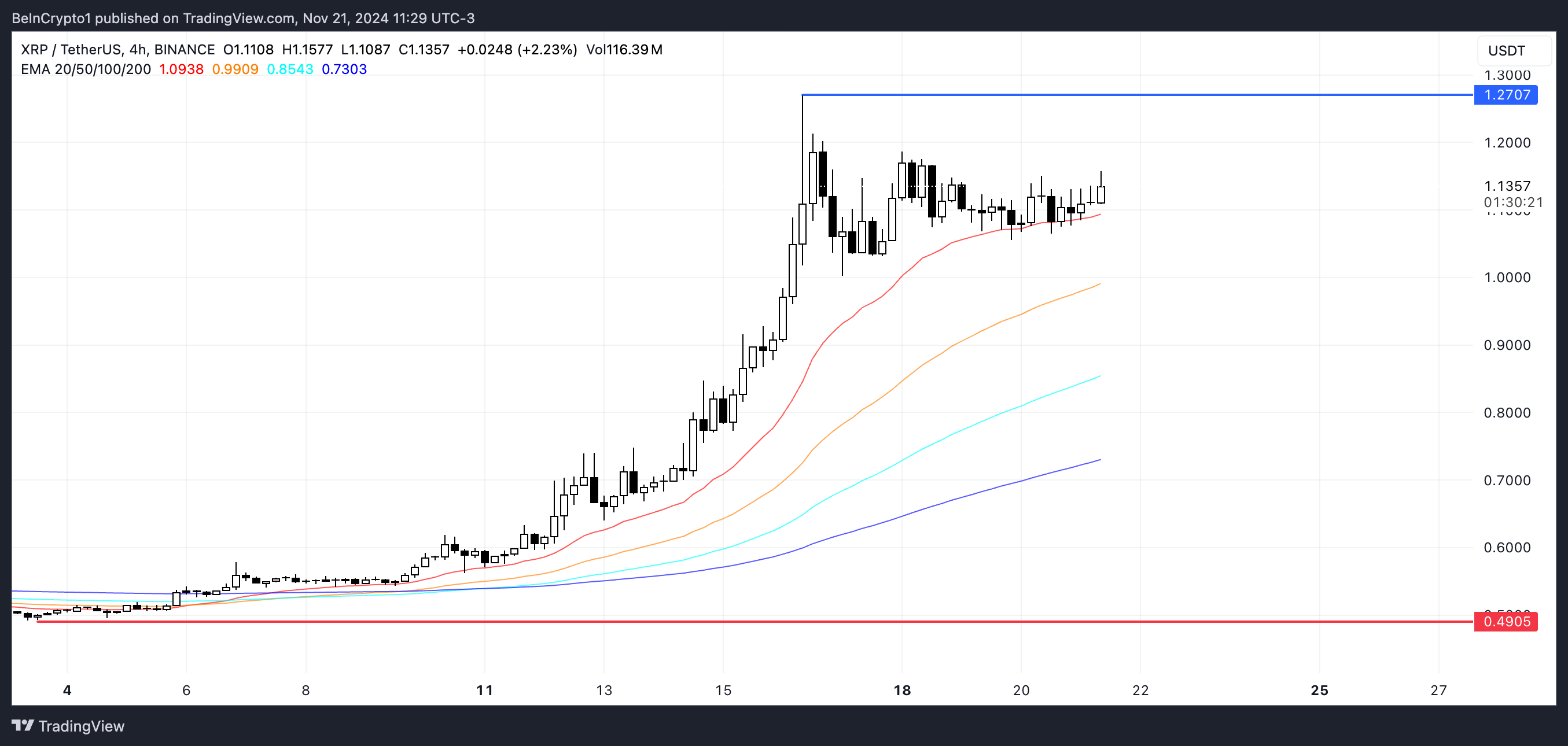XRPのEMAラインは現在、短期ラインが長期ラインの上に位置し、価格がすべてのラインの上で取引されているため、上昇傾向を示している。