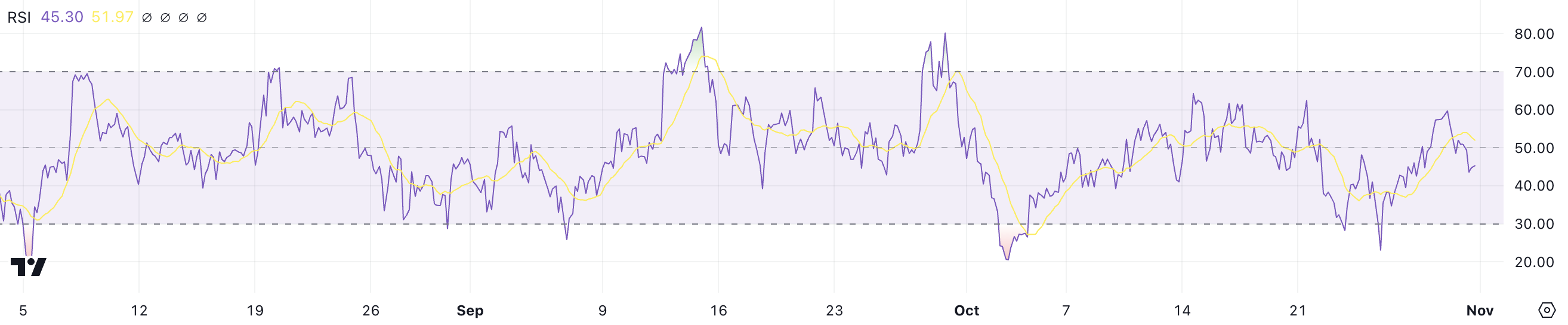 XRPのRSIは数日前の60以上から45.30に下がりました。この減少は買いの勢いの減少を示唆しており、最近の上昇が勢いを失ったことを示しています。