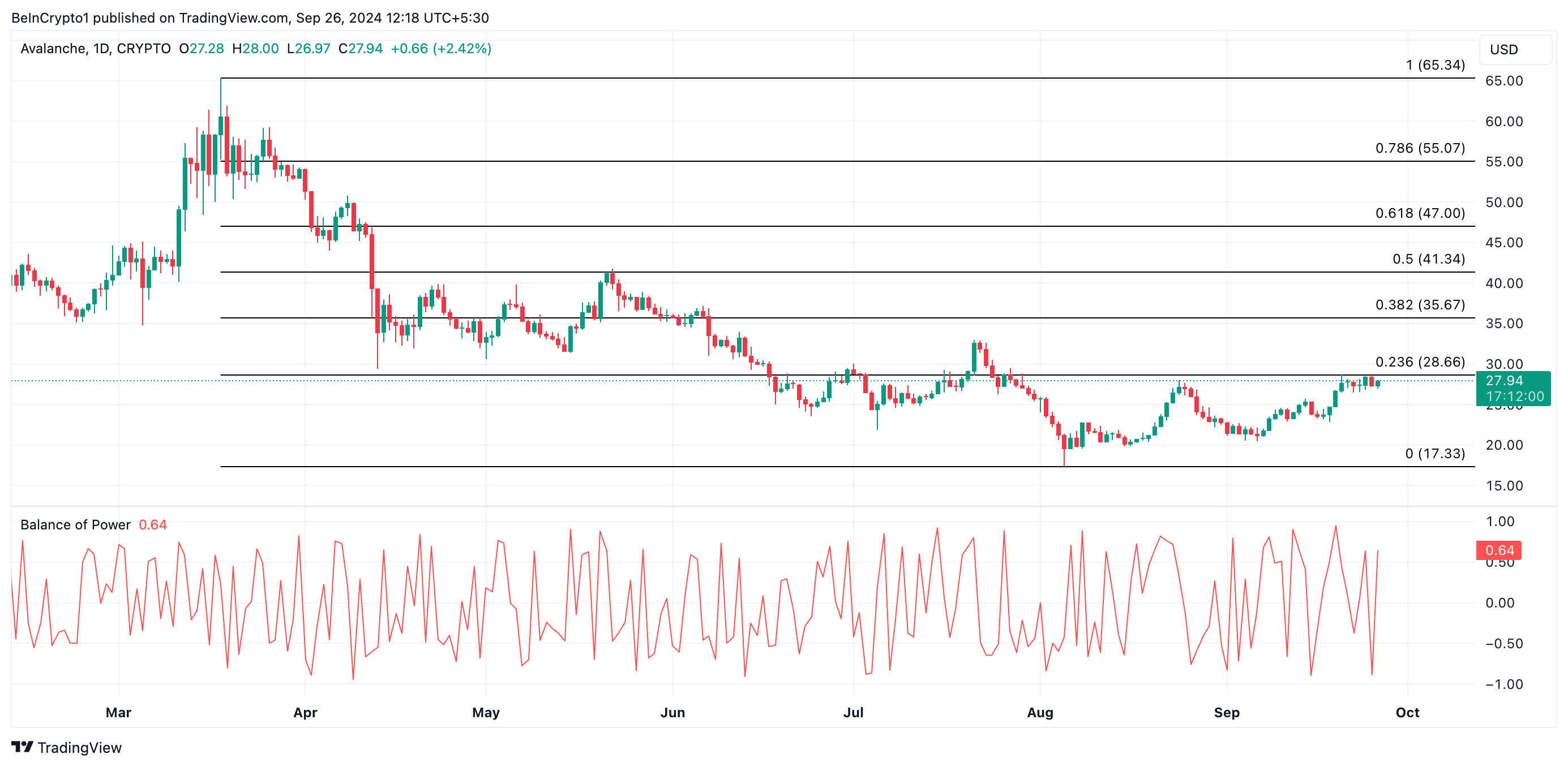 Layer-1ブロックチェーンAvalancheのネイティブトークンであるAVAXは、先週8%の価値上昇を記録し、この記事の執筆時点で27.94ドルで取引されています。日足チャートによると、AVAXは7月から保持している28.66ドルの大幅なレジスタンスレベルに近づいています。