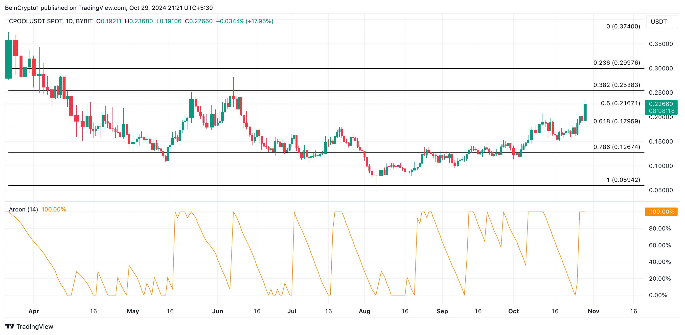 CPOOLの上昇トレンドが強まる場合、その価格は0.25ドルに上昇する可能性があり、現在の0.22ドルの価値と年間最高値0.37ドルの間の最も重要な障壁である。この障壁を上回ることに成功すれば、この価格ピークに近づく道を開く。