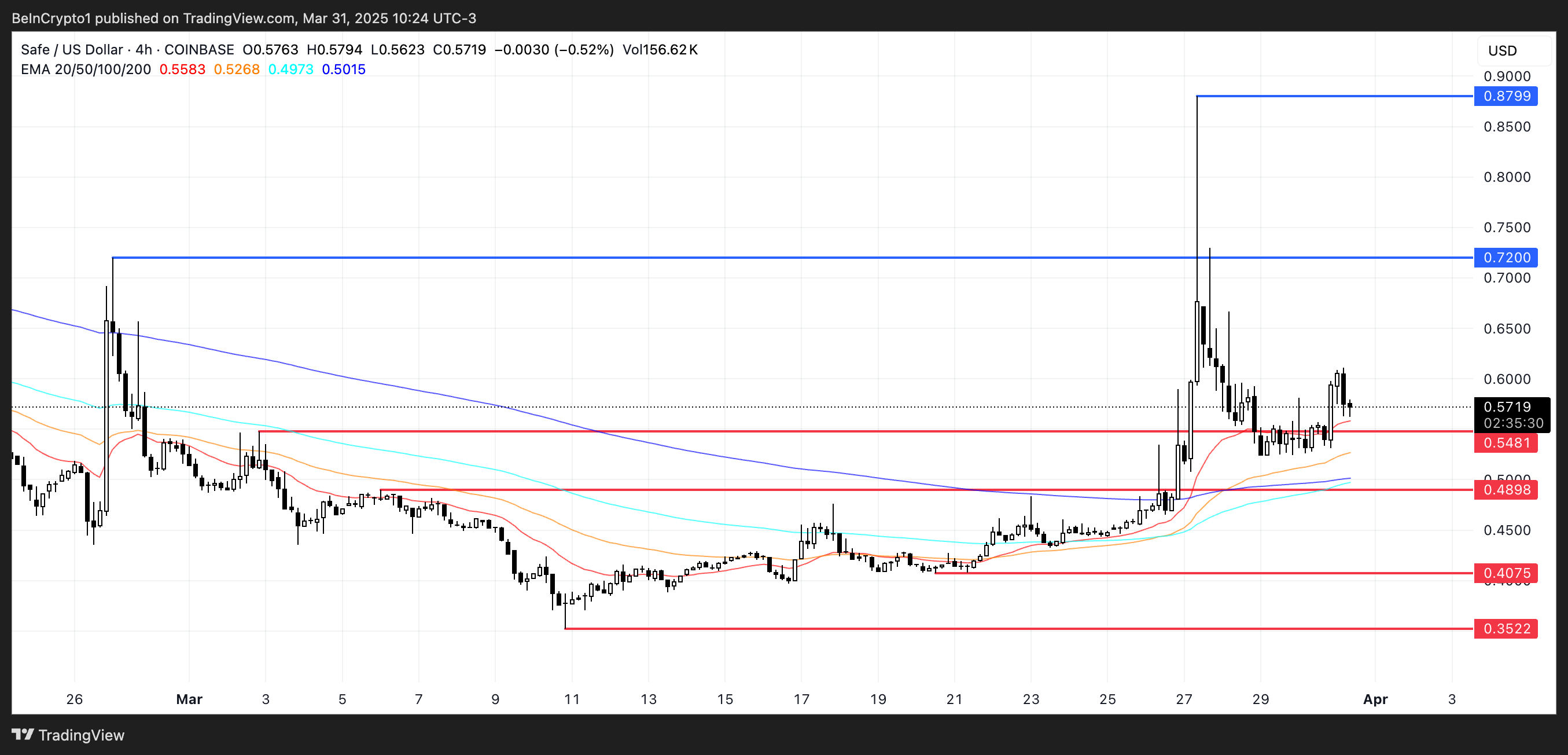トレンドが反転した場合、SAFEは現在の価格に非常に近い0.54ドルの近くのサポートレベルを試す可能性がある。