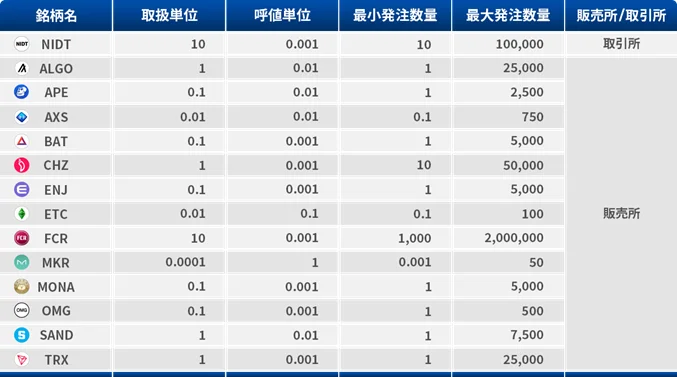 新規で取り扱うのは、「ニッポンアイドルトークン(NIDT)」、「アルゴランド(ALGO)」、「エイプコイン(APE)」「アクシーインフィニティ(AXS)」、「ベーシックアテンショントークン(BAT)」、「チリーズ(CHZ)」、「エンジンコイン(ENJ)」、「イーサリアムクラシック(ETC)」、「エフシーアールコイン(FCR)」、「メイカー(MKR)」の14銘柄。