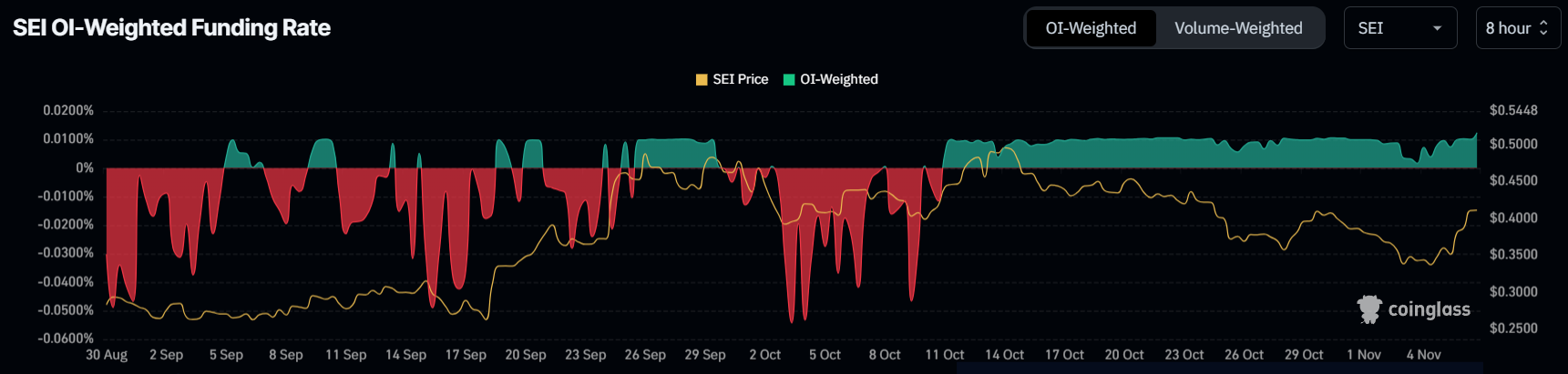 SEIの資金調達率は過去1か月間、主にポジティブであり、トレーダーの間で強気の見方を反映しています。このポジティブな資金調達率は、トレーダーがSEIに長期ポジションを積極的に取っていることを示し、価格の継続的な上昇を期待しています。ポジティブな資金調達率は、より高いレベルでのコインのサポートをトレーダーが望んでいることを示し、上向きの軌道を維持するために重要です。