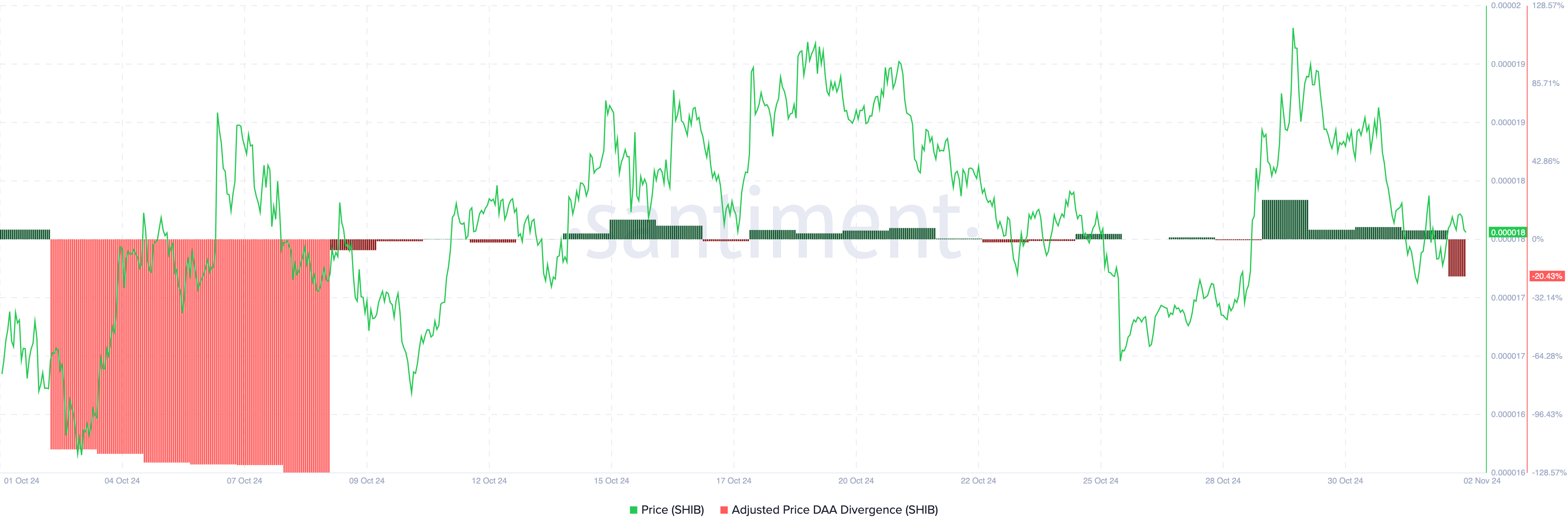 先月のほとんどの間、柴犬コインの日次アクティブアドレス(DAA)の乖離はプラスを保ち、価格の安定した成長とユーザーの増加が反映された。価格DAA指標は、ユーザーの関与がSHIBの価格パフォーマンスとどのように相関するかを測るものだ。両者が同時に上昇する場合、アクティブなユーザーの関与が価格トレンドを支えていることを示す。