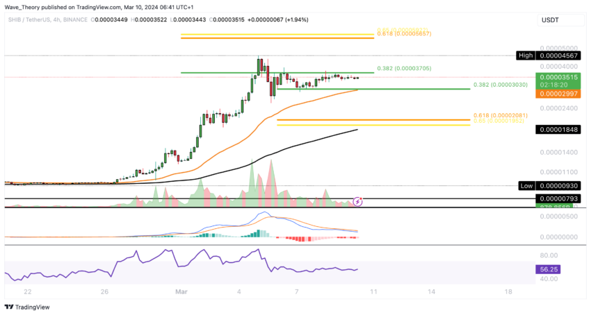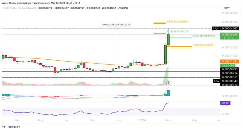 Shiba Inuコインの価格は過去10日間で約267%急騰し、約0.000037ドルの重要なフィボナッチ抵抗レベルに到達した。SHIBがこのレジスタンスを破れば、次の注目すべきフィボナッチレジスタンスは0.000057ドル付近となります。